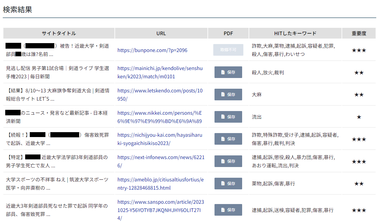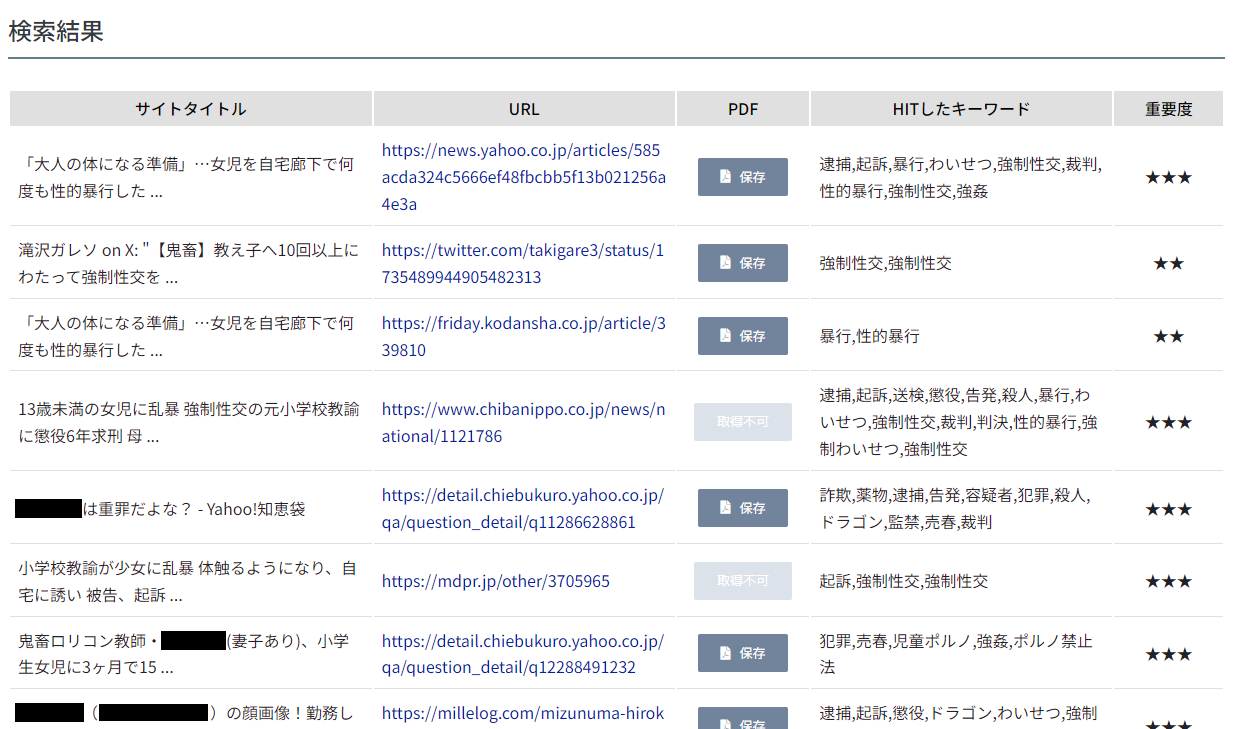 | 収集 | WEBの仮名化及び削除 忘れられる権利による匿名化で、チェックから漏れる可能性がある。 (例:⼭⽥容疑者→Y⽒→30代男性) 弁護⼠によるネガティブ記事の削除請求により、該当記事が消失する可能性がある。 | WEBの該当記事を自動保存 独⾃開発のクローラー(⾃然⾔語処理)を24時間運⽤し、該当記事を自動保存。 |