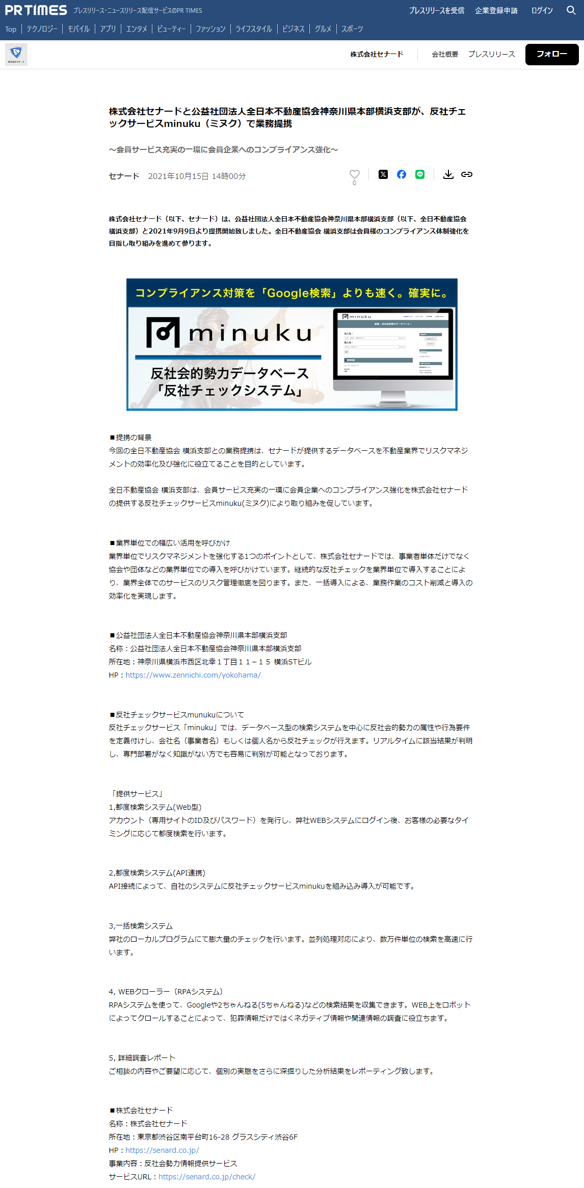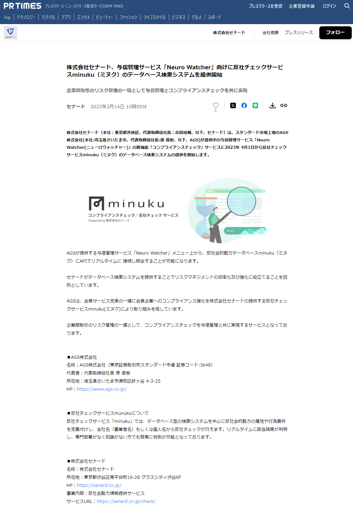 「コンプライアンスチェック」「反社チェック」を行った人物名で、過去に実名報道されていた場合、minukuのデータベース及びリアルタイムWEB検索でヒットします。