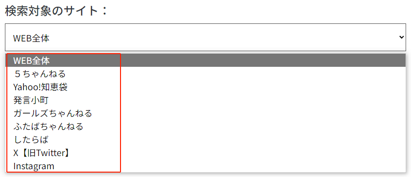 WEB検索は、Google検索を網羅する「WEB全体」と、サイトやSNSなどの絞り込み検索が可能です。